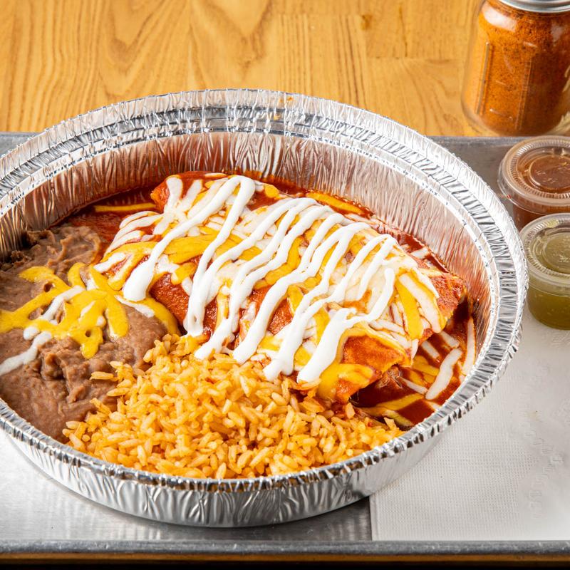 Includes rice, beans, cheese & sour cream (red or green sauce)